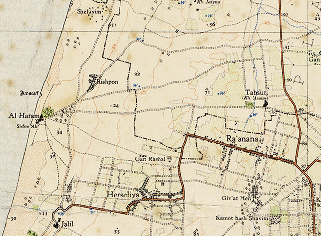 המפה מטה ככל הידוע לנו היא הראשונה בה מופיע מושב רשפון והיא הופקה בשנת 1937 על ידי הבריטים כשהמושב היה בן שנה. במפה זו נראים הישובים היהודיים שפיים (1932 בהרצליה ג` ו-1936 במקום הנוכחי), הרצליה (1925), רעננה (1922), גבעת ח"ן (1933) ורמות השבים (1933) והכפרים הערבים תאבסור, אל-חרם ואל-ג`ליל (אזור סינמה סיטי של היום).