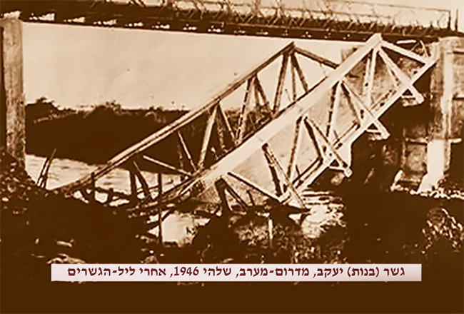 גשר הפלדה הראשון קרס, כחלק מהמאבק לסילוק השלטון הבריטי מארץ-ישראל. היה זה ב"ליל-הגשרים" בין 16-17 יוני 1946, כשכוח של ההגנה, שבין משתתפיו היה גם מאיר פעיל, פוצץ אותו ליד סמך הבטון המערבי וחלקו המערבי של הגשר צנח למי הירדן.