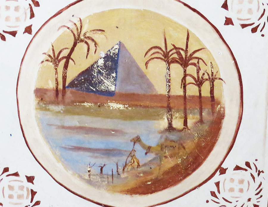 ניסיתי לדמיין איך נראה החדר במיטבו לפני כשמונים שנה. הרמתי מבט אל המצולעים המעוטרים כשָׁטִיחַ ובתוכם איור גיאומטרי או תיאור נוף. במרכז אחד המצולעים צויר גשר ועצי דקל ברקע ובריבוע אחר - הפירמידות.